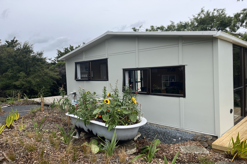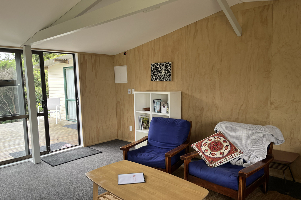 Booking the accommodation of your choice - Queen Cottage, Twin Cabin, or both, gives you exclusive use of the open-plan living and dining shed. The Shed has undergone a complete makeover, in time for the Summer of 2025. The vintage kitchen has been reinstated and the claw foot bath outside the window planted up as a landscape feature. Fully insulated and with a brand new heat pump, the Shed is a great place to relax, with decks either side for your choice of bush or sea views.