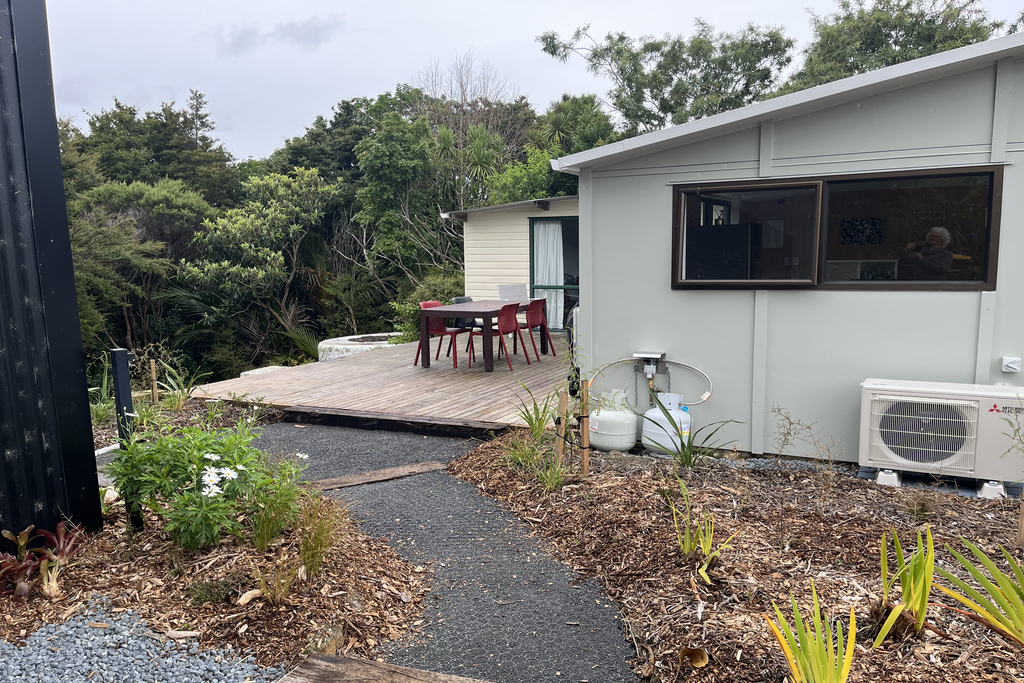 Our accommodation includes two sleeping cabins - one Queen and one Twin Single - a living/cooking Shed, a separate bathroom/laundry "Outhouse", and decks with sea or bush views. We provide linen, all normal kitchen stuff (crockery, cutlery), including fridge, microwave, BBQ, jug, toaster and television, wifi, heat pumps, off street parking, . All you need to bring is food and drink for your stay, clothes, and a smile.