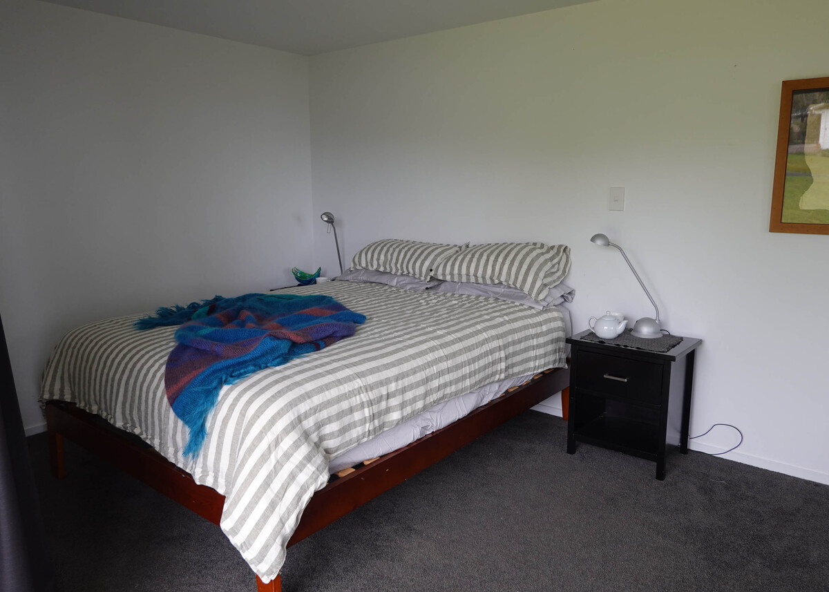 The Queen Cottage sits slightly apart from the other buildings, and has a covered verandah facing the western sunset. Sleep in the comfort of a luxury queen bed; enjoy a cup of tea in bed in the morning. While our compound (that's what they called a collection of separate buildings on Grand Designs recently) of buildings hark back to the old days of an "Outhouse", our modern version has a flushing toilet, shower and laundry. We provide dressing gowns for our guests to visit the Outhouse warm and if necessary an umbrella - 3 metres from the end of the verandah along a pebble path.