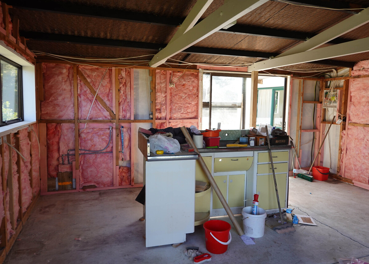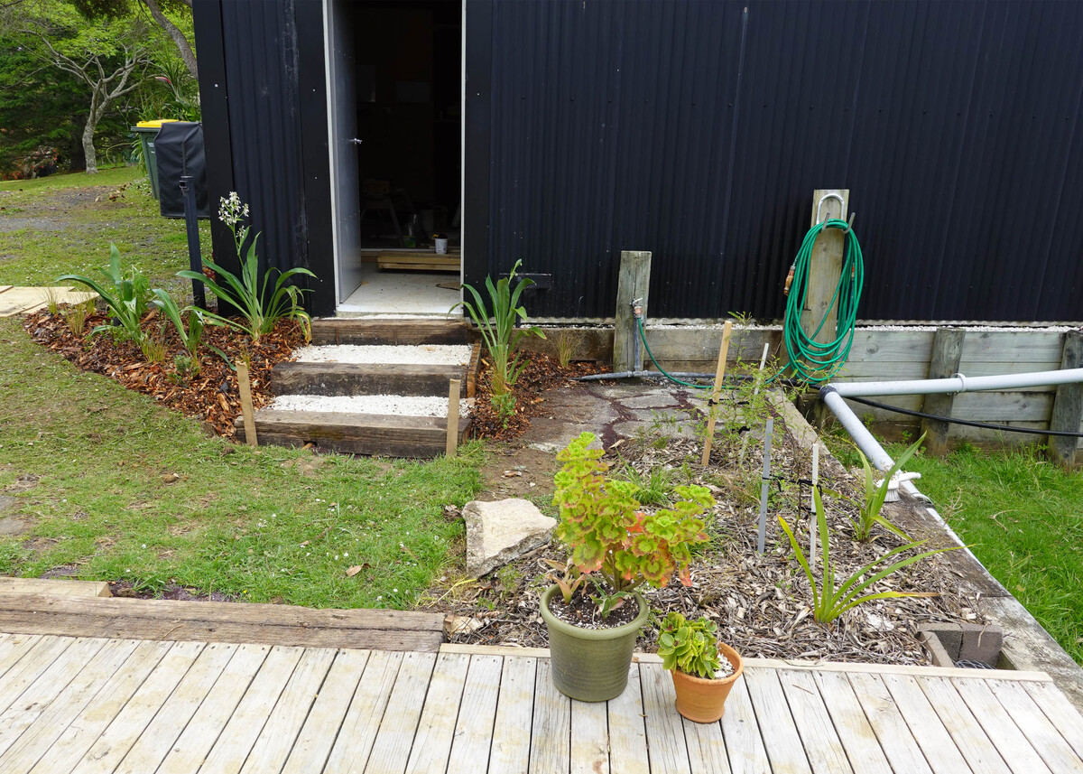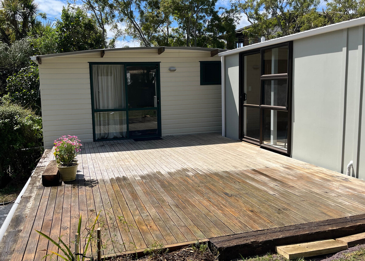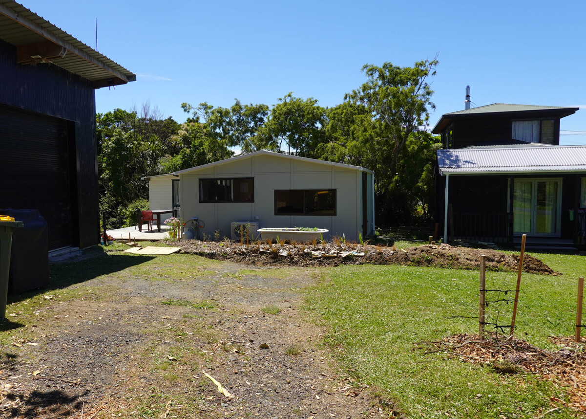 Booking the accommodation of your choice - Queen Cottage, Twin Cabin, or both, gives you exclusive use of the open-plan living and dining shed. The Shed is undergoing a complete makeover, in time for the Summer of 2025. Building works are now largely complete - just the floor finish to go and we will be putting it back together. The vintage kitchen has been reinstated and the claw foot bath outside the window planted up as a landscape feature. Fully insulated and with a brand new heat pump, the Shed will be a great place to relax, with decks either side for your choice of bush or sea views.